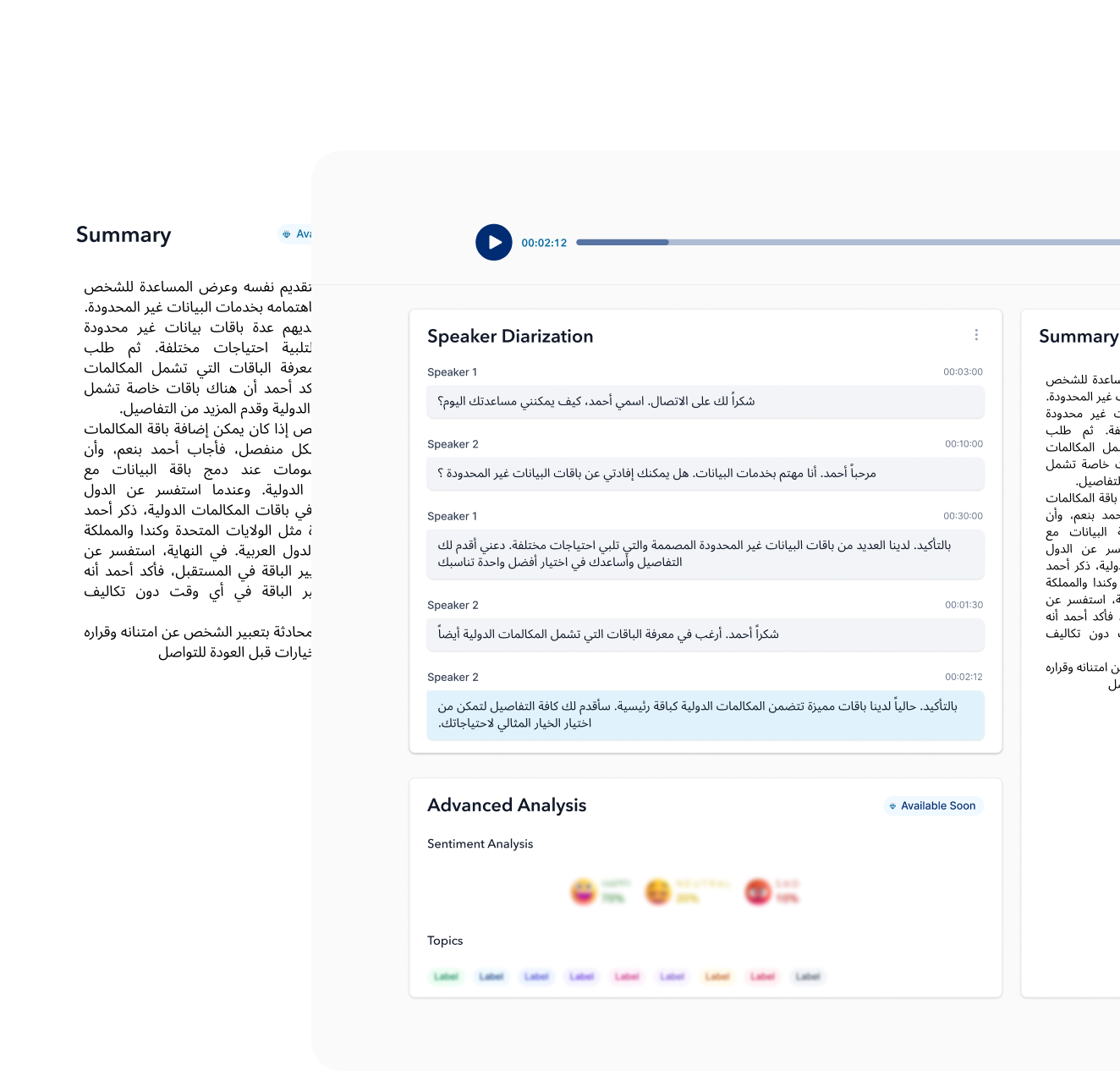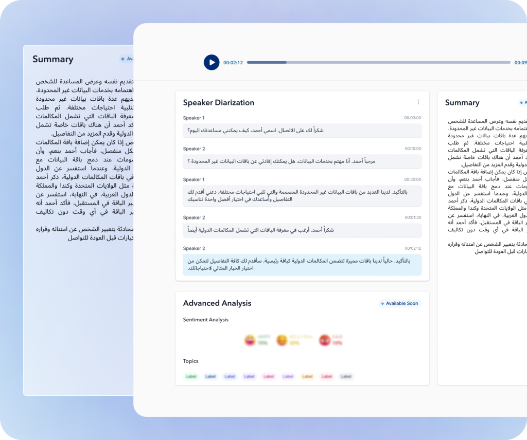 AIM Voice offers state-of-the-art voice analytics technology specifically optimized for Arabic languages, providing powerful tools for businesses looking to extract valuable insights from voice interactions.