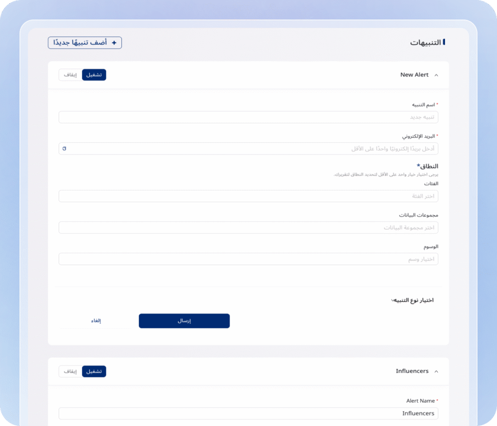 تتيح إعدادات التنبيه المخصصة داخل لوحة البيانات مراقبة كلمات وعبارات محددة من خلال مجموعة متنوعة من أنواع التنبيهات، بما في ذلك تنبيهات الكلمات الرئيسية، وتنبيهات المؤثرين، وتنبيهات متابعي المؤثرين، وتنبيهات إشارات المؤثرين.