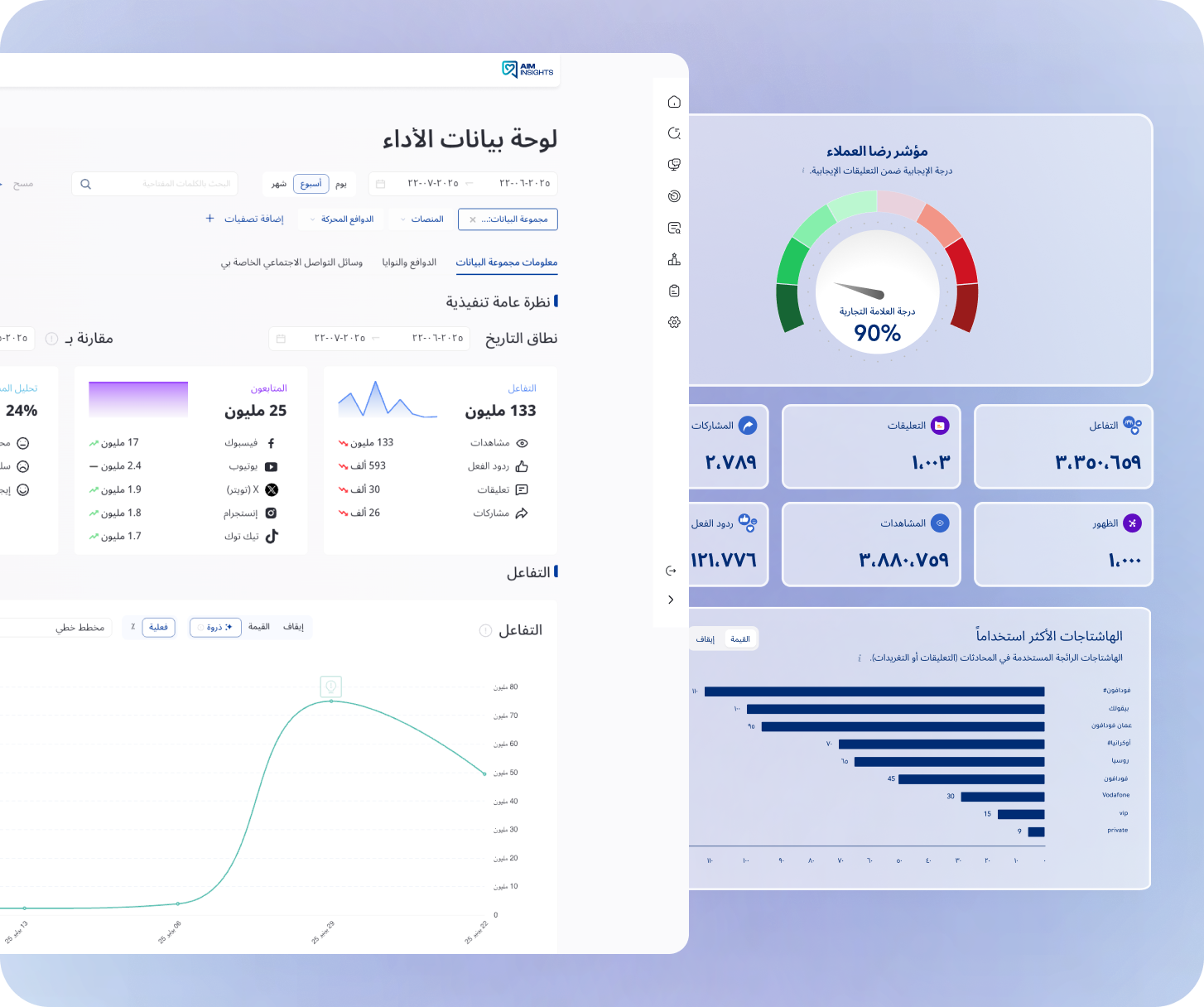 تقارير مفصلة حول الإعجابات، المشاركات، التعليقات، والوصول الكلي، مع الإطلاع على فعالية أنواع المنشورات المختلفة عبر المنصات المتنوعة.
